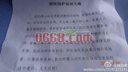 老 老夫子2013 幼儿园 注册 2012-12-10 消息 3 反馈评分 0 点数 0 2013-08-06 #1 昨天,见同事说:政府强行征农田,100多元一平方米,农民不同意,昨夜三更半夜打烂村民家的门强硬抓人进派出所。 附件 未标题-2.bmp 未标题-2.bmp 1.4 MB · 查看: 210 211626psndmt7zvahawv2u.jpg 152.5 KB · 查看: 143 211800ezl2y080wwwwbwh0.jpg 151.4 KB · 查看: 167 211807hgz12llup1g2g4g5.jpg 61.1 KB · 查看: 177