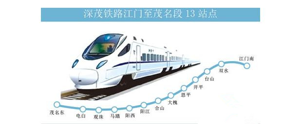 据环评资料显示,江门至茂名段线路东起广珠城际的江门南站,沿途经江门、阳江、茂名等市,正线全长265公里。设江门南、双水、台山、开平、恩平、大槐、合山、阳江、阳西、马踏、观珠、电白、茂名东等13个车站,设计时速为200公里。