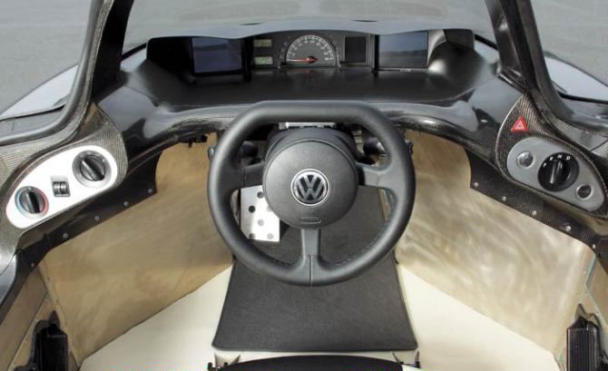 为了达到1升的耗油量目标,风阻系数必须严格控制,1升车确定有2个座位,而车前部必须尽可能的小,这才附合空气动力学,仅有的选择是将2个座位成一条直线排列,就像竞速的滑雪长橇以及滑翔机一样。入口是一个1.5米长的欧翼式车门,从左边开启,这样进出更加方便。