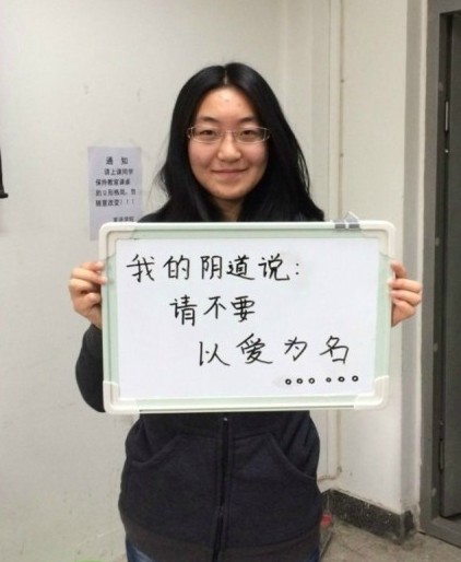 近日北京外国语大学一群女生为宣传话剧《阴道之道》,拍摄了17张举白板的系列照片,命名为“我的阴道说”,在网上引发巨大争议。女生们在白板上写的内容包括:“我的阴道说:我要尊重!”、“我的阴道说:她只听我的!”、“我的阴道说:非诚勿扰”,还有一句想必刺痛了很多人的神经,“我的阴道说:初夜是个屁!”。在接受媒体记者采访时北外英语学院书记表示,“开展关怀女生的活动是可以理解的,校团委审核通过,内容也应该是健康的。”
