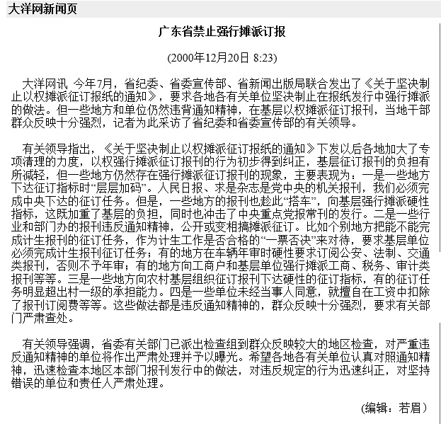 二问:报纸不能互相传阅吗?为什么非要要人手一份,一日鲜的东西,看完就丢,有违节约,算不算是奢侈浪费?最近看新闻说不允许政府企业印刷贺年卡,除了奢侈浪费外,还有砍伐树木破坏环境,我不禁要问,天朝如此发行党报党刊难道就不破坏环境了?