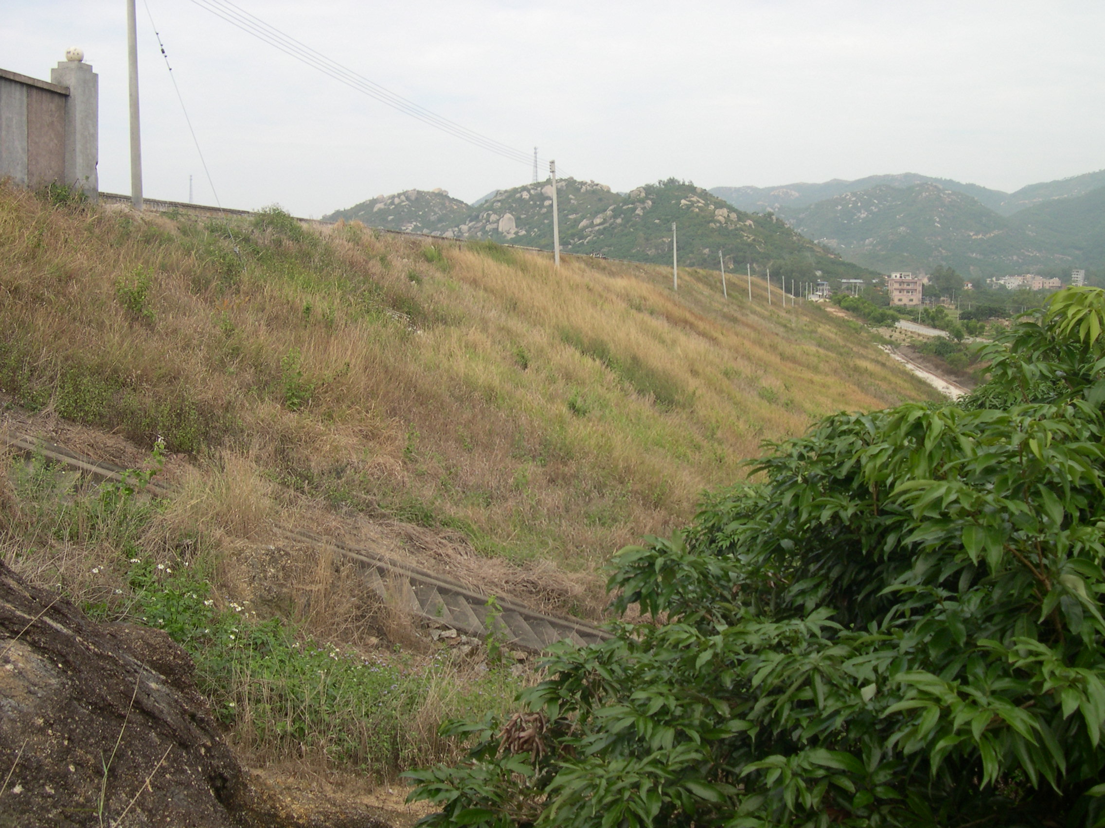 热水水库主坝外观。大坝坡面荒草萋萋,“热水水库”四个水泥浇筑的大字仍清晰可见