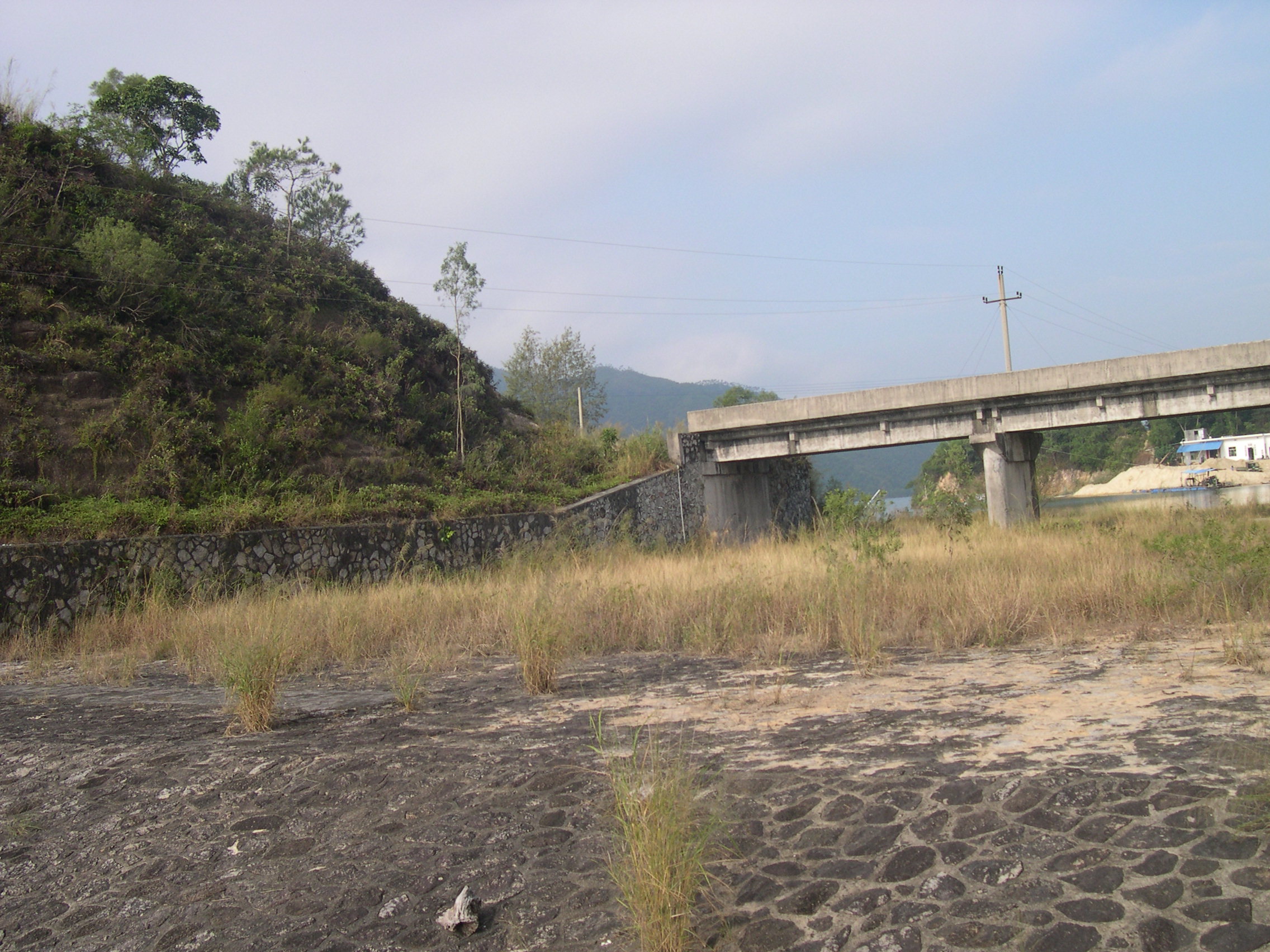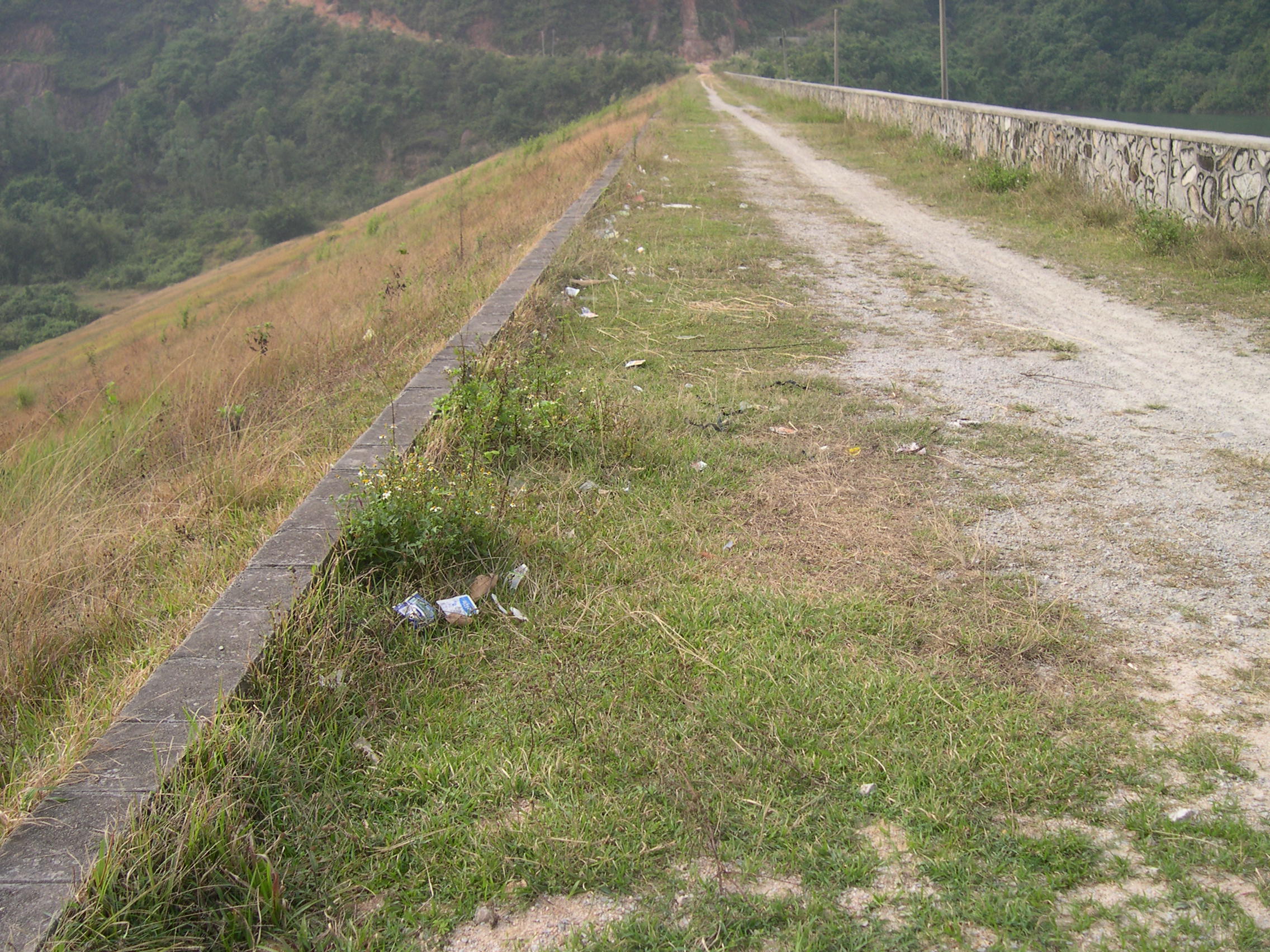 河角水库临水坝面是五大水库中唯一的石砌护坡,坝顶上也还是沙土路
