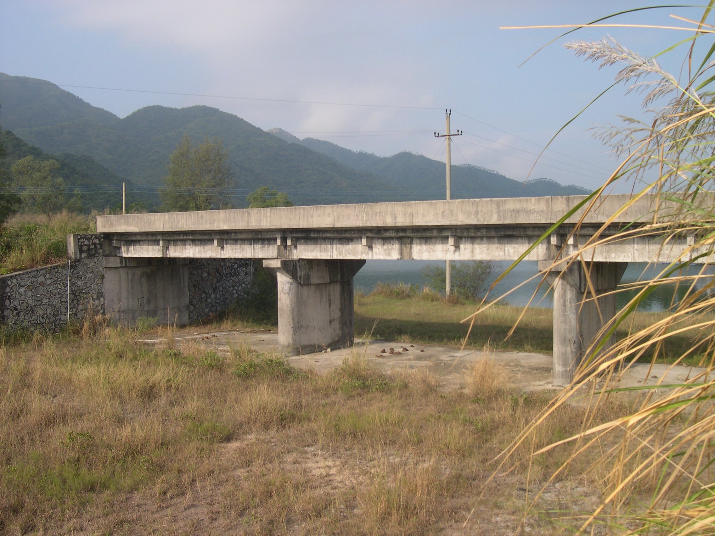 溢洪道长满了杂草,上方建有防洪交通桥