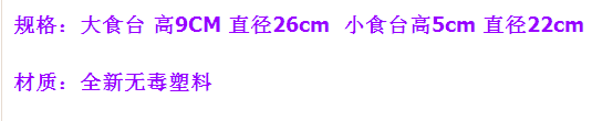 广大龟友通常喂龟龟的食台都是用瓦煲盖/电热炉底座,(缺点:难清洗,容易压死龟苗)往往还需要预定抢购,本公司经过市场调研,推出专业设计的龟龟喂食台,欢迎广大龟友使用,它非常容易清洗,方便加层, 防龟龟爬龟食导致掉水的现象, 防意外闷死龟龟。规格:大食台 高9CM 直径26cm , 小食台高5cm 直径22cm 。