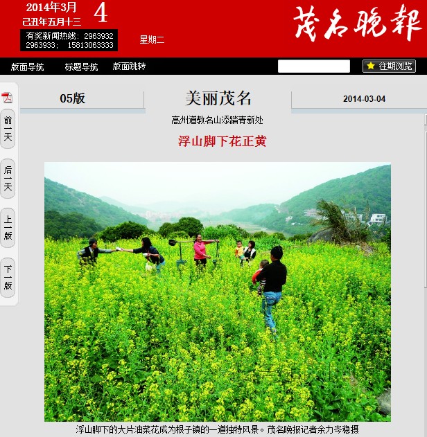 活动安排:3月8日星期六早上7:40-8:00在电白客运中心站集合(地图B点),8:00准时出发,过时不候!行程首先从水林路经林头/霞洞化普进根子,在根子墟汇合茂名市区网友尝地方美食,然后再出发到浮山村委会平山田村看油菜花、游览冼太庙爬浮山岭,从浮山岭下撒后再视情况而安排聚餐(费用一般约30元/人以下,现场AA,也可自理),返程经羊角上七那线返水东,全程约110公里。