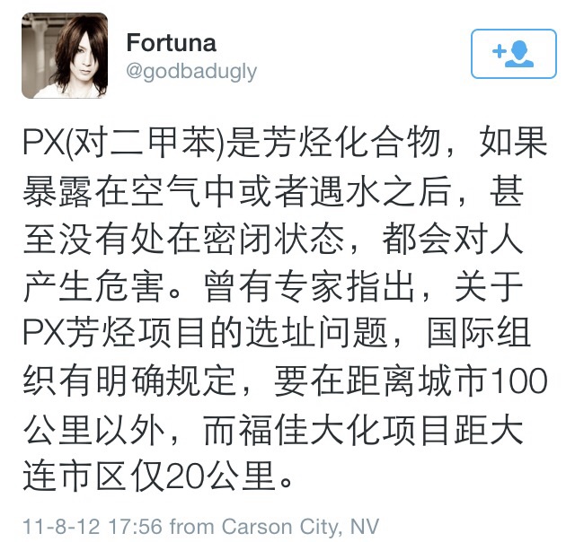 2012年10月29日,在宁波市政府宣布“坚决不上PX”第二天,网名“一毛不拔大师”的BJ商人贝志诚发微博称,“将自费购买专业检测设备,到全国PX工厂周围检测工厂排出含硫化物、苯等有害物质的废气和废水,来判断PX生产中排出物的污染情况”。