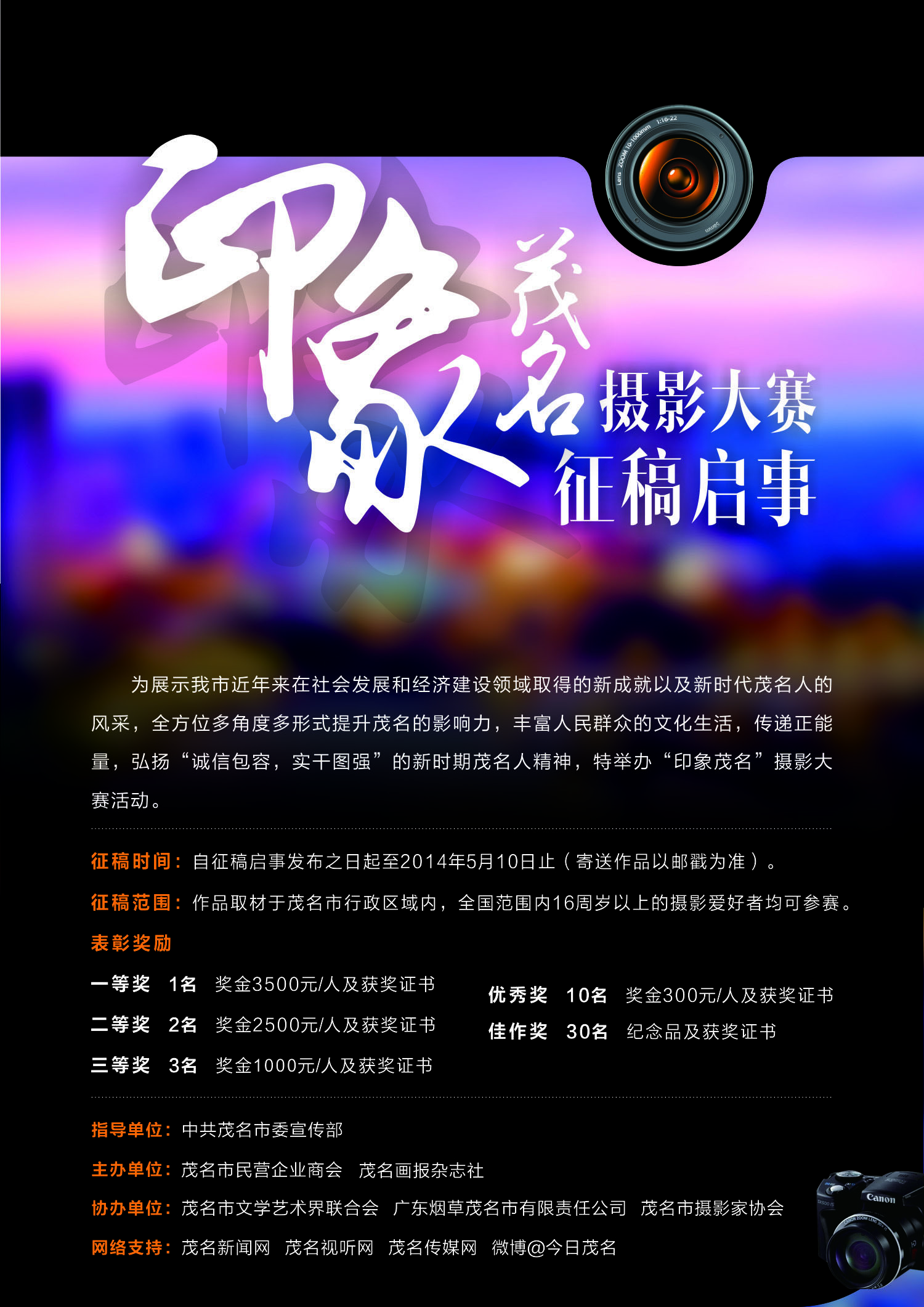作品取材于茂名市行政区域内,全国范围内16周岁以上的摄影爱好者均可参赛。