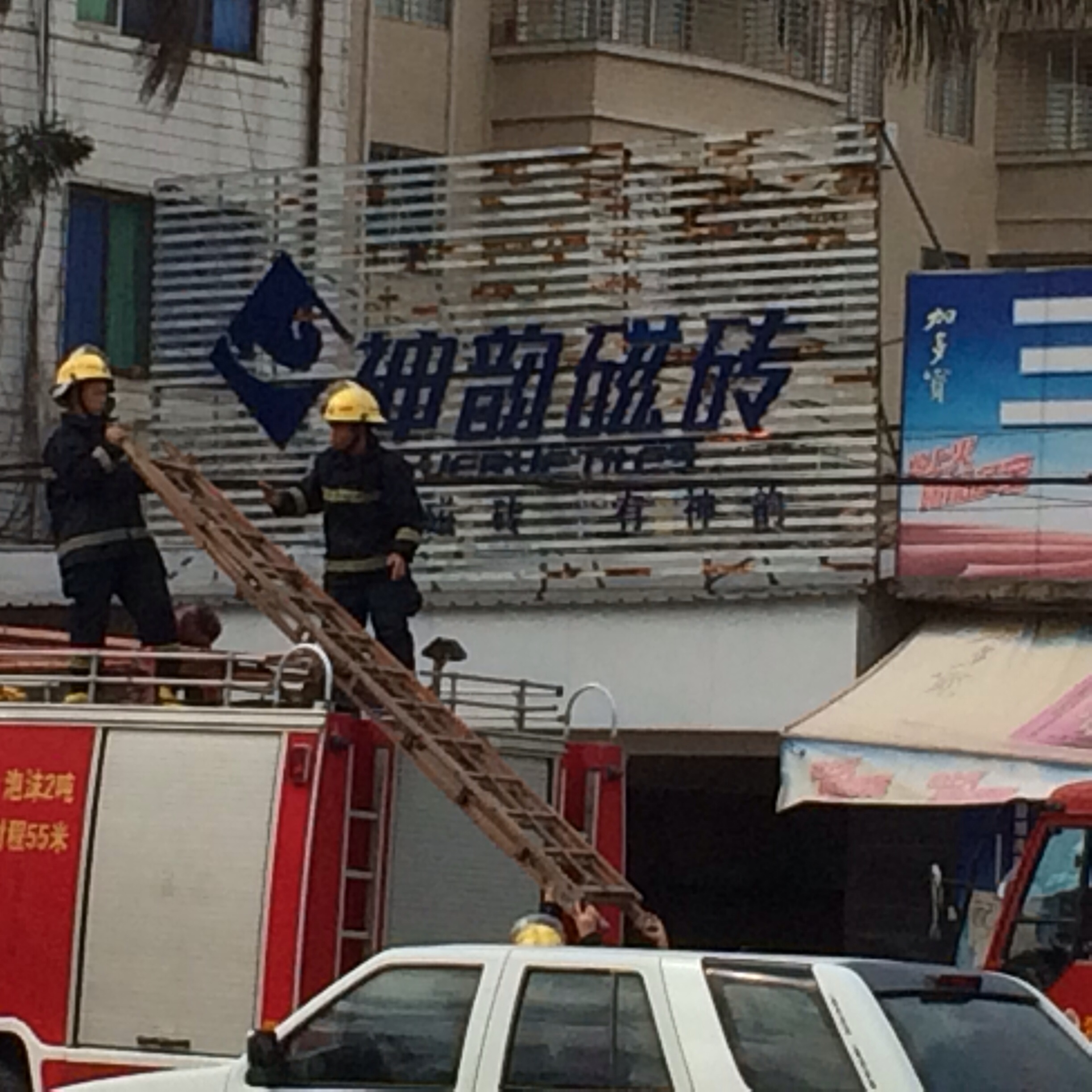 可能是招牌路线短路造成火警,出动两辆消防车,不到两分钟将火扑灭!。