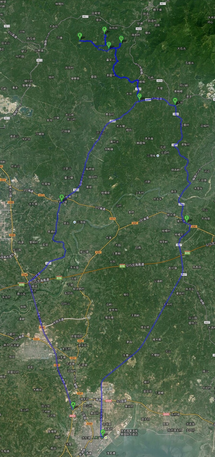 水东出发线路图 (A那楼大转盘高水公路路口,B羊角镇,C化普里,D根子柏桥,E摘荔枝果场,F贡园,G红荔阁,H返程X656入口,I林头中学,J水东)