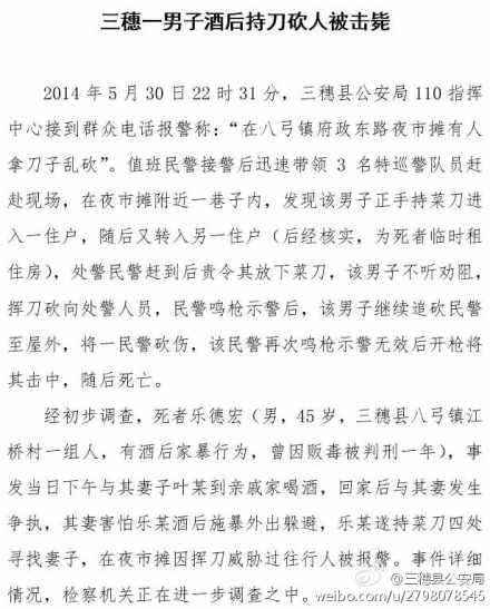 5月30日,贵州三穗县发生警察掏枪打死一农民事件。死者名叫乐德宏,起因是夫妻两发生口角,妻子躲藏。死者喝过酒拿菜刀四处寻找妻子,路人报警。警方出警后,在乐德宏租住的屋子里将其击毙。"