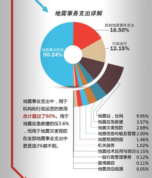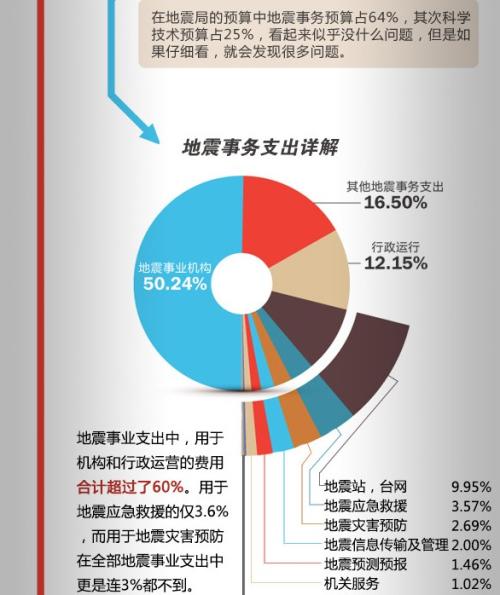 在地震事业支出中,用于机构和行政运营的费用合计超过了60%;用于地震应急救援的仅占3.6%,而用于地震灾害预防在全部地震事业支出中连3%都不到。在对科学技术支出的详解中,社会公益研究占到了一半以上,达51.36%,其次是38%的机构运行费用,而基础研究支出仅占0.58%。