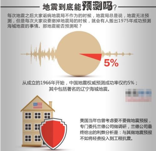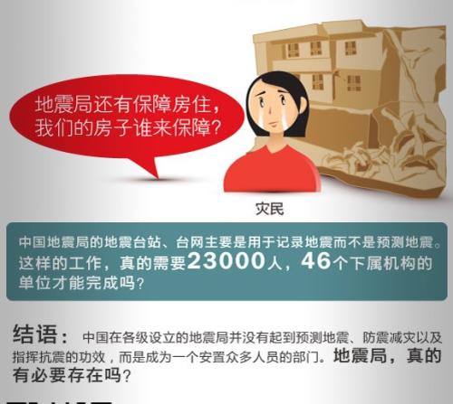 图片最后质疑,中国地震局的地震台站、台网主要是用于记录地震而不是预测地震。中国在各级设立的地震局并没有起到预测地震、防震减灾以及指挥抗震的功效。这个拥有2.3万人、46个下属机构的单位,真的有必要存在吗?