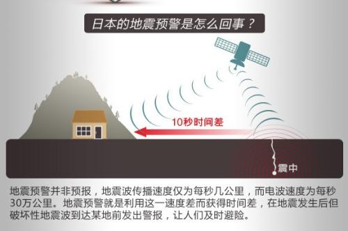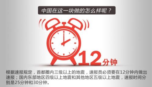 图片还列出,日本的地震预警是在地震发生后,抢在地震波传播到设防地区前,向设防地区提前几秒至数十秒发出警报,以减小当地的损失。而根据中国的速报规定,首都圈内三级以上的地震,速报员必须要在12分钟内做出速报;大陆东部地区四级以上地震和其他地区五级以上地震,速报时间分别是25分钟和30分钟。