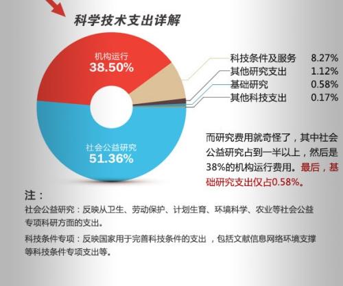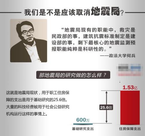 图中说,这就是地震局的现状:用于职工住房保障的支出是用于基础研究的25.6倍,大量的科技经费被用于社会公益研究机构运行这样的事情上。