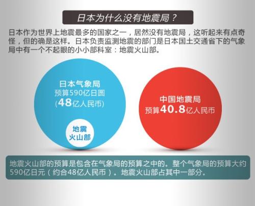 图片说,日本作为世界上地震最多的国家之一,并没有地震局。日本负责监测地震的部门是日本国土交通省下的气象局中一个不起眼的小小科室:地震火山部。该部门的预算包含在气象局的预算之中,而整个气象局的预算大约590亿日元,约合48亿人民币。