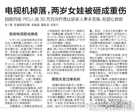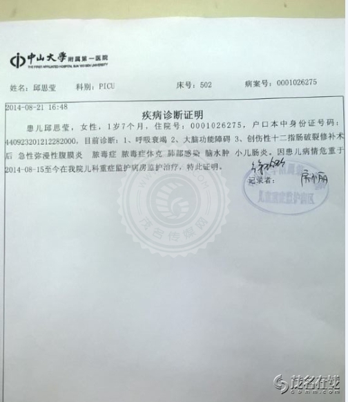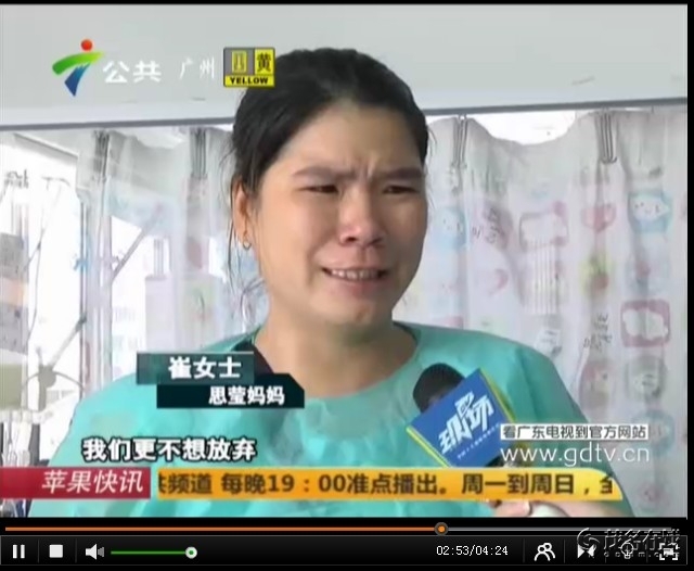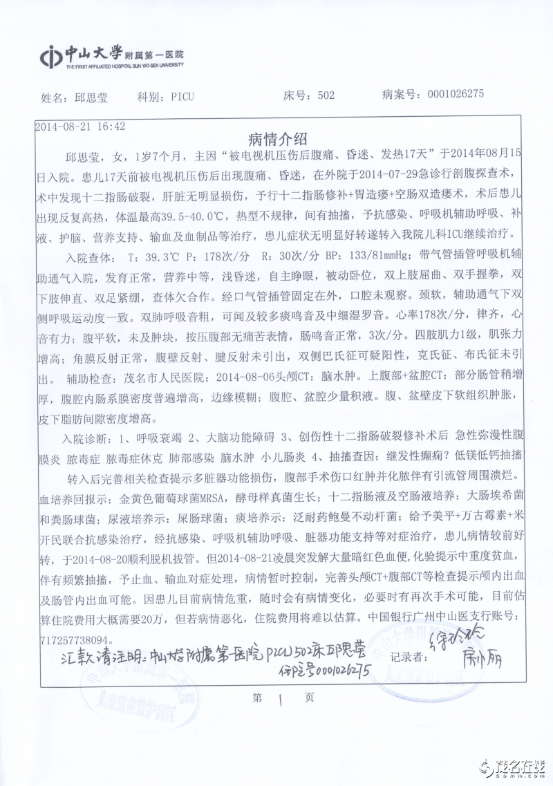 邱思莹,1岁7个月,正是一个最爱跑动、攀爬的年龄段, 2014年7月29日,小思莹与3岁的哥哥一起攀爬玩耍时发生了意外,家里的老式电视机从桌子上掉了下来,正好砸在她身上,造成重伤。在茂名市人民医院被诊断为十二指肠破裂,急性弥漫性腹膜炎,感染性休克,肝挫裂伤,急性应激性溃并出血,多器官功能障碍综合症,在外科重症监护室(SICU)中经过半个多月的治疗后因该院无法继续治疗,与8月15日转入了中山大学附属第一医院,在该院的PICU中深切治疗部己十天,每天1万~3万元的治疗费使这个农民家庭陷入绝望中, 这期间都是向别人借钱治病,早已负债累累,也没办法继续借钱。尽管还未脱离危险,但是病情已经有所好转,医生说康复的机会很大,一定要坚持。家里人听到这个消息既高兴又担心,在这大半个月的急救治疗中已经用完了家中所有的积蓄,尽管如此,我们从来没有放弃救治小思莹的任何一个机会,然而接下来的治疗费用初步估计还要20万甚至更多,希望各界善心人士能踊跃献出爱心,让小思莹的生命可以得以延续 9月1日晚广东公共频道DV现场新闻报导链接http://v.gdtv.cn/html/ItemId68/2014-09-01/176179.html