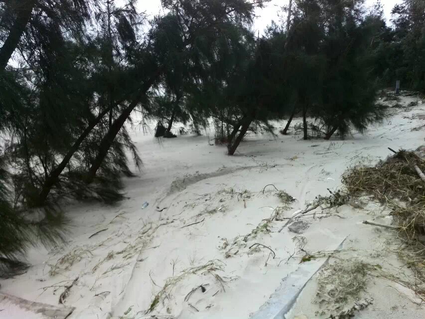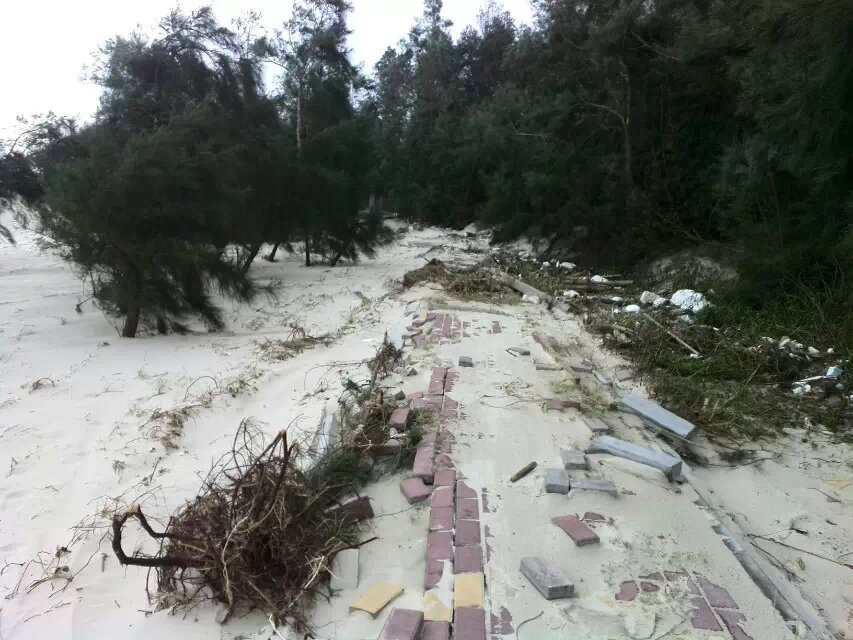 当地群众反映说台风当日,海水直漫浪漫海岸的后门(供当地渔民出入)外的道路上,因此冲坏绿道就难以避免了。,