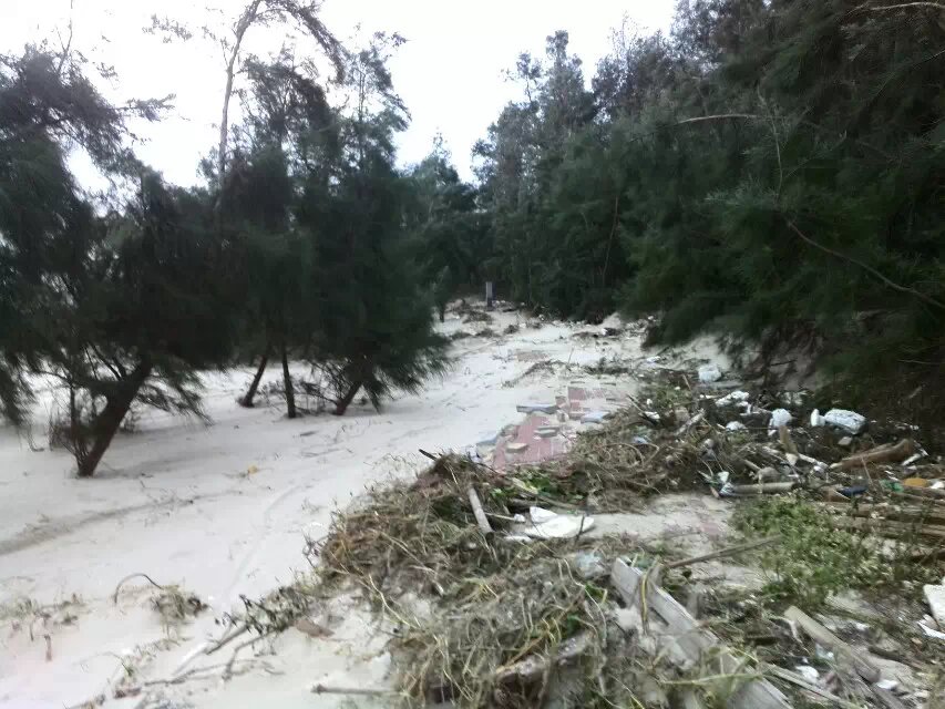 我们仔细观察,被冲毁的绿道处堆满垃圾,明显可见是台风卷起海浪,直袭海滩上面的林带中的绿道,推开泥沙,冲走砖石,导致绿道溃不成径,有的地方几乎连绿道的痕迹都难寻了。