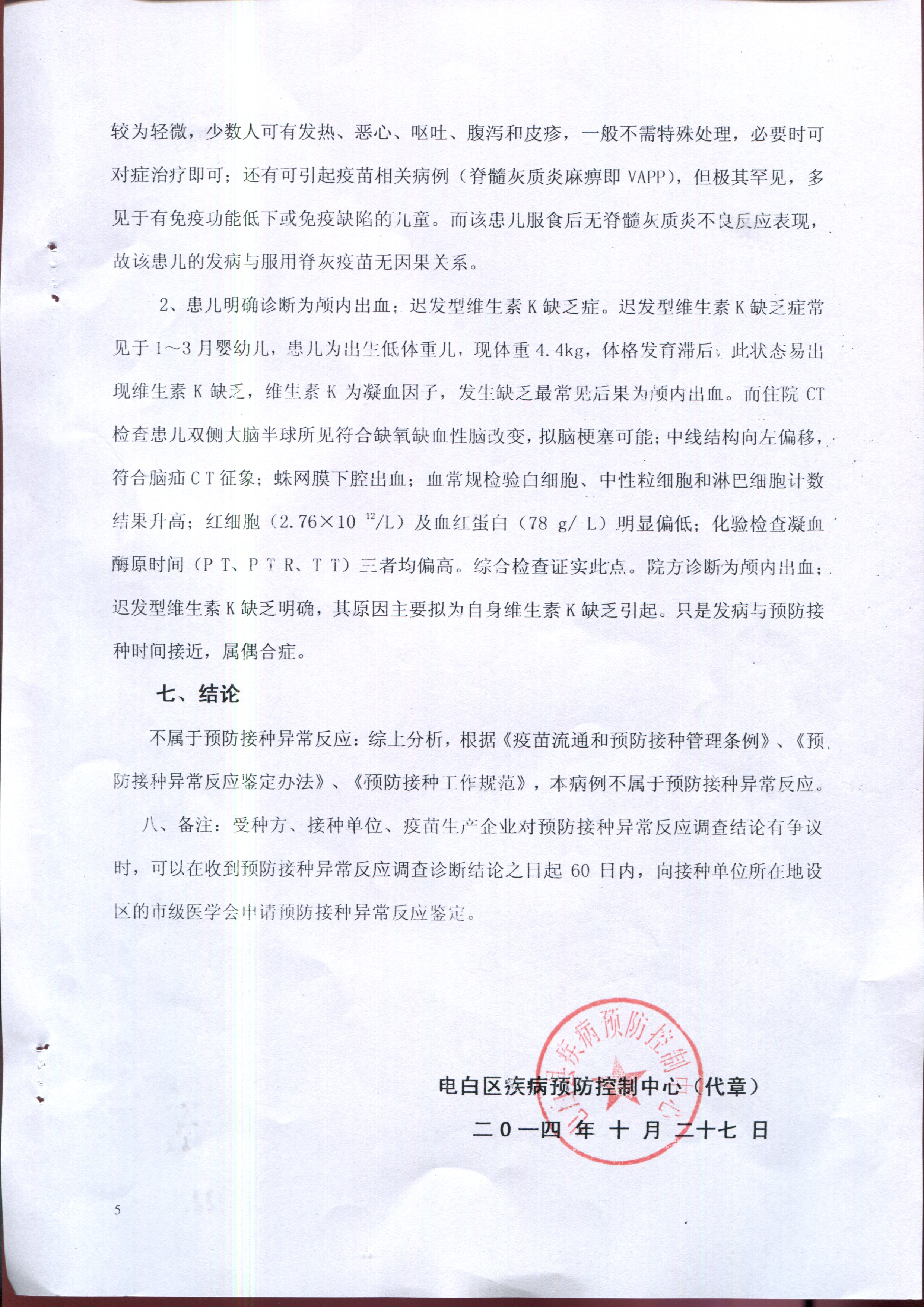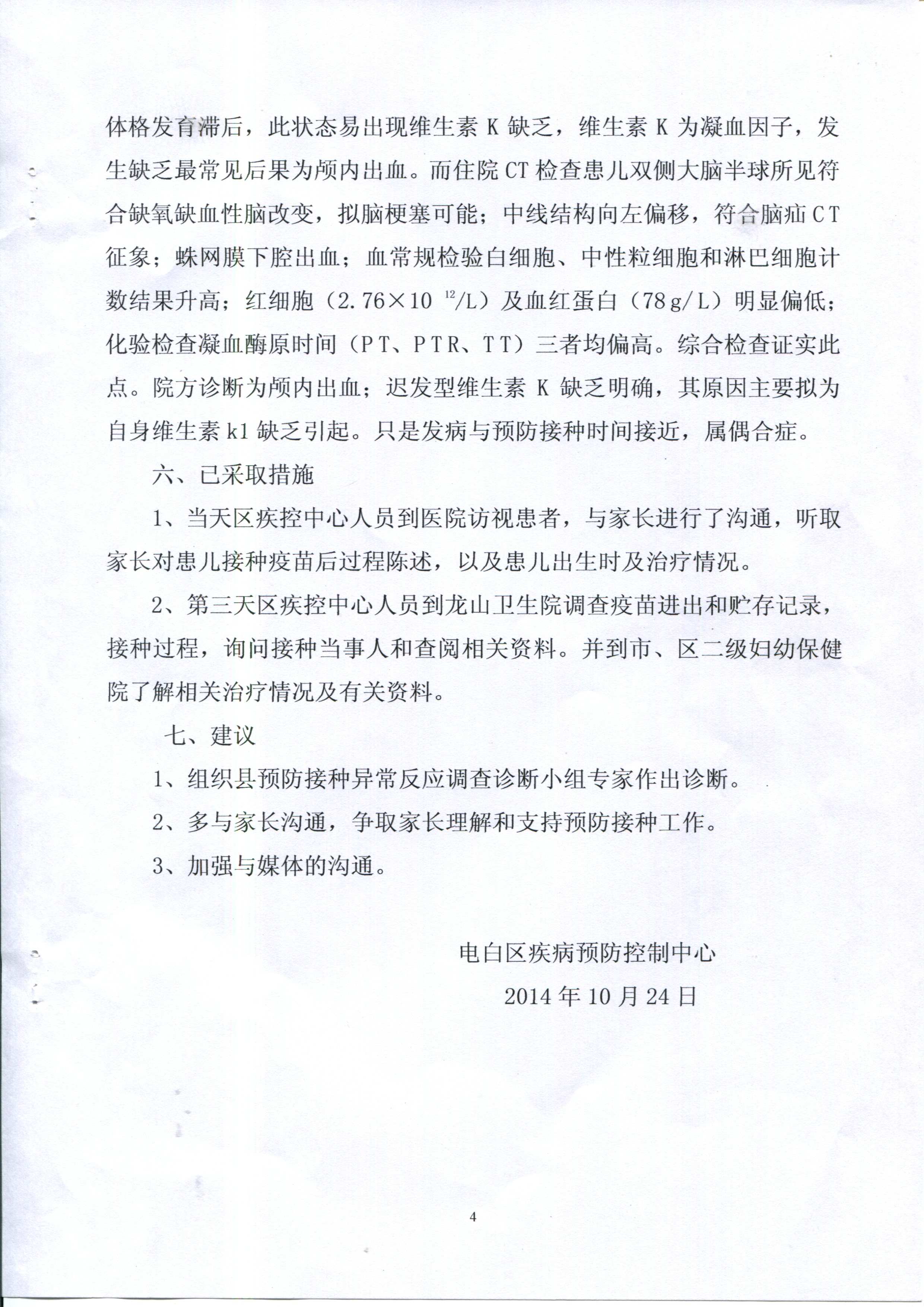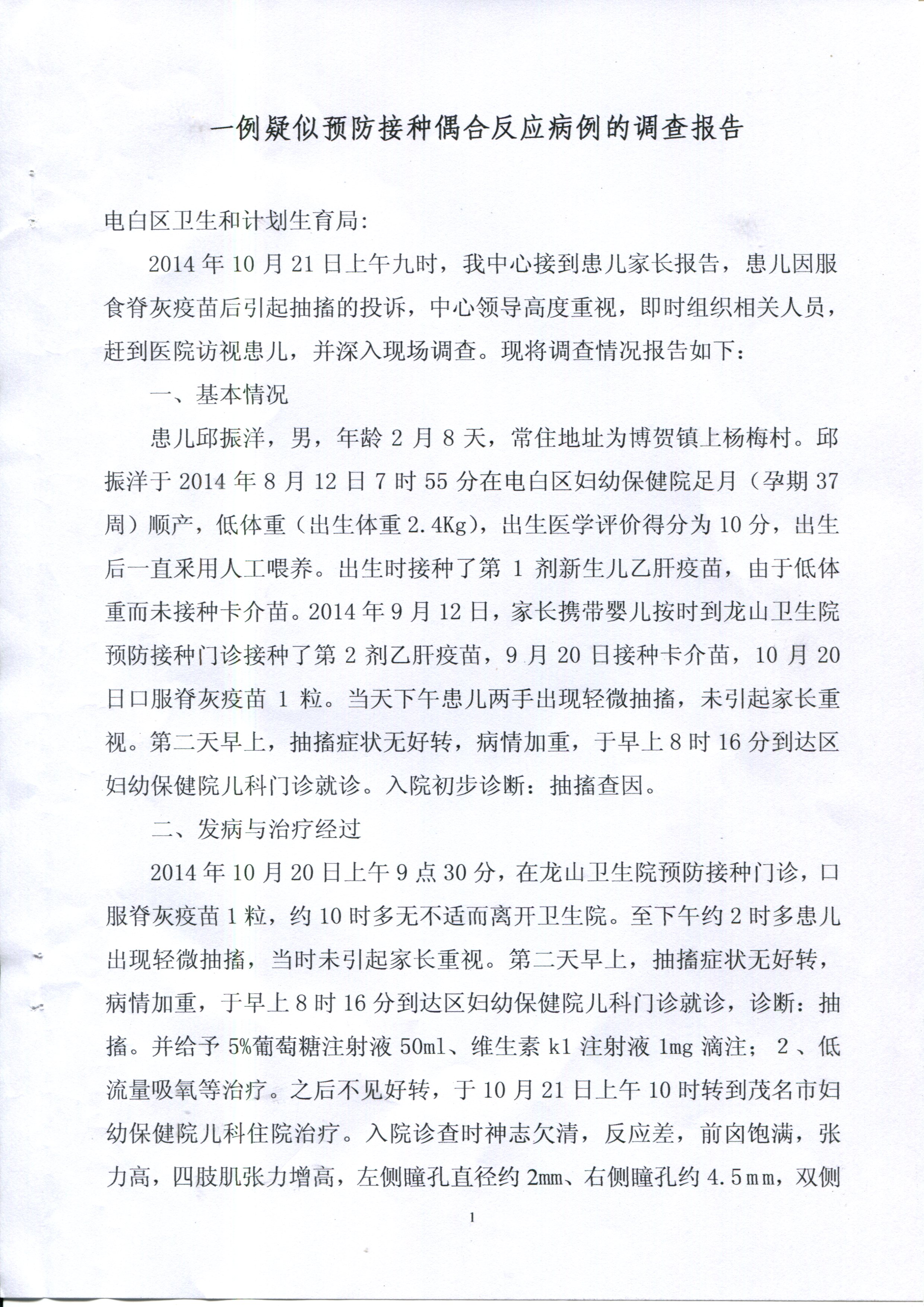 蜡 蜡笔小昕 幼儿园 注册 2008-10-11 消息 11 反馈评分 0 点数 0 2014-10-28 #5 QUOTE(蜡笔小昕 @ 2014年10月28日 Tuesday, 04:10 PM) 关于邱振洋(贴中吃糖丸小孩)事件的回应 邱振洋事件经电白县疾病预防控制中心鉴定,受种者邱振洋服食的脊灰疫苗合格,患者颅内出血是迟发型维生素K1缺乏引起,属于预防接种偶合症,与服食脊灰疫苗无关,请广大网民勿信谣言。现附上电白区预防接种异常反应调查诊断结论、电白区预防接种异常反应调查诊断书、一例疑似预防接种偶合反应病例的调查报告。附件如下:[attachmentid=334098][attachmentid=334099] [snapback]3711533[/snapback] [attachmentid=334100][attachmentid=334101] 附件 调查报告3.jpg 1.3 MB · 查看: 510 调查报告4.jpg 1.1 MB · 查看: 518