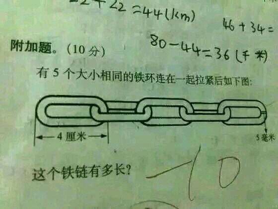 让孩子看图想明白每次相扣有多长的实体不能计算长度。我是工程师,不是数学老师,分析仅供参考。实在不行就用手指相扣让孩子量,工程师比较笨,宁愿算手指头也不碰理论数学。