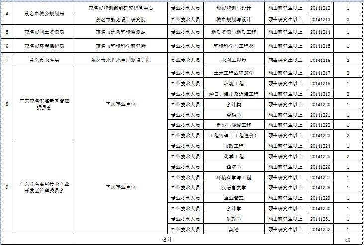 广东省茂名市2014年公开招聘事业单位急需紧缺专业人才职位表 序号 主管部门 招聘单位 职位名称 所需专业及专业方向 学历及学位条件 职位代码 招聘人数 1 茂名市财政局 茂名市财政信息中心 专业技术人员 应用经济学、工商管理 硕士研究生以上 20141201 2 2 茂名市交通运输局 茂名市交通运输局交通管理总站 专业技术人员 交通运输规划与管理 硕士研究生以上 20141202 1 专业技术人员 法学 硕士研究生以上 20141203 1 茂名市交通运输局茂南分局交通管理站 专业技术人员 港口、海岸及近海工程 硕士研究生以上 20141204 1 专业技术人员 应用化学 硕士研究生以上 20141205 1 茂名市交通运输局茂港分局交通管理站 专业技术人员 桥梁与隧道工程 硕士研究生以上 20141206 1 茂名市茂名港无线电话台 专业技术人员 应用化学 硕士研究生以上 20141207 1 3 茂名市住房和城乡建设局 茂名市建设工程质量检测站 专业技术人员 岩土工程 硕士研究生以上 20141208 1 专业技术人员 光学 硕士研究生以上 20141209 1 茂名市建设工程质量检测站直属分站 专业技术人员 结构工程 硕士研究生以上 20141210 1 茂名市建设工程安全和燃气检测站 专业技术人员 油气储运工程 硕士研究生以上 20141211 1 4 茂名市城乡规划局 茂名市规划编制研究信息中心 专业技术人员 城市规划与设计 硕士研究生以上 20141212 1 茂名市规划设计研究院 专业技术人员 城市规划与设计 硕士研究生以上 20141213 3 5 茂名市国土资源局 茂名市地质环境监测站 专业技术人员 地质资源与地质工程 硕士研究生以上 20141214 1 6 茂名市环境保护局 茂名市环境科学研究所 专业技术人员 环境科学与工程类 硕士研究生以上 20141215 1 7 茂名市水务局 茂名市水利水电勘测设计院 专业技术人员 水利工程类 硕士研究生以上 20141216 2 8 广东茂名滨海新区管理 委员会 下属事业单位 专业技术人员 土木工程或建筑学 硕士研究生以上 20141217 2 专业技术人员 环境工程 硕士研究生以上 20141218 1 专业技术人员 港口、海岸及近海工程 硕士研究生以上 20141219 2 专业技术人员 会计类 硕士研究生以上 20141220 1 专业技术人员 金融学 硕士研究生以上 20141221 1 专业技术人员 桥梁与隧道工程 硕士研究生以上 20141222 1 专业技术人员 工程管理(工程造价) 硕士研究生以上 20141223 2 9 广东茂名高新技术产业 开发区管理委员会 下属事业单位 专业技术人员 市政工程 硕士研究生以上 20141224 1 专业技术人员 化学工程 硕士研究生以上 20141225 2 专业技术人员 经济学 硕士研究生以上 20141226 1 专业技术人员 环境科学与工程 硕士研究生以上 20141227 1 专业技术人员 汉语言文学 硕士研究生以上 20141228 1 专业技术人员 企业管理 硕士研究生以上 20141229 1 专业技术人员 会计学 硕士研究生以上 20141230 1 专业技术人员 财政学 硕士研究生以上 20141231 1 专业技术人员 英语 硕士研究生以上 20141232 1 合计 40