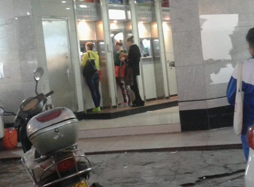 途经人民路与西湖路交界见有三位外国女土"孩"在柜员机取钱"诂计她们也会看中文吧?",拟见她们手上都挂着几个礼包,诂计她们去购物时也是用中文"普通话或粤语白话"与店主店员沟通的吧?(应该不会黎话吧