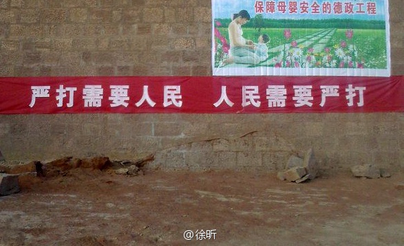 第二条横幅是:严打整治净化社会风气,严密防范消除治安隐患。――陈村镇人民政府 宣
