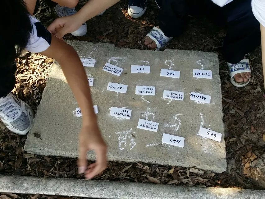 1、老师先用白色绳子订草地上做为起跑线,然后在距离起点70米的地方把写好题目的纸牌错乱摆放。