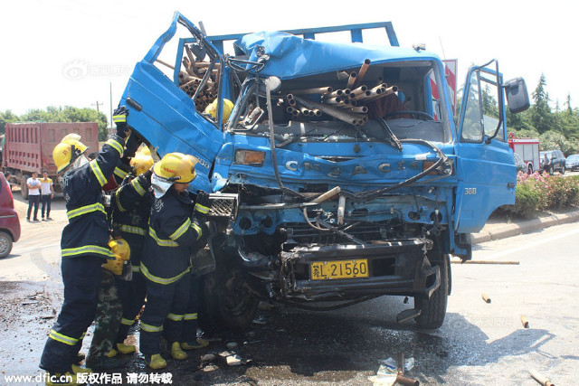 2015年5月21日,江苏镇江,一辆拉建筑钢管的镇江牌照大货车,在路口处撞上一辆正转弯的江西牌照工程运输车相撞。事故导致两车损坏,镇江牌照大货车车头严重变形。其中一辆货车被大量钢管穿透驾驶室,驾驶人及副驾驶位置的乘坐人受伤被困,副驾位置男子尤其伤重。经过救援,两人脱离生命危险。摄影:万凌云/东方IC