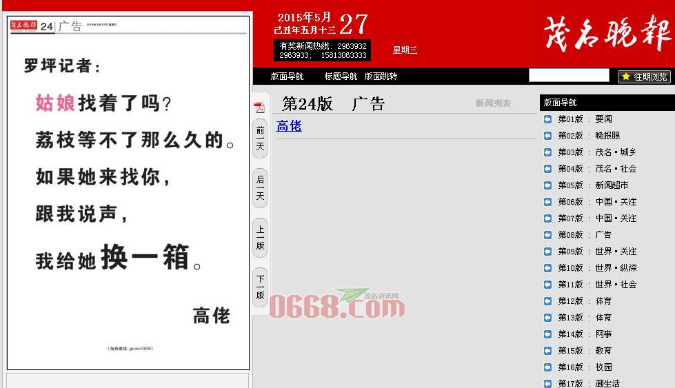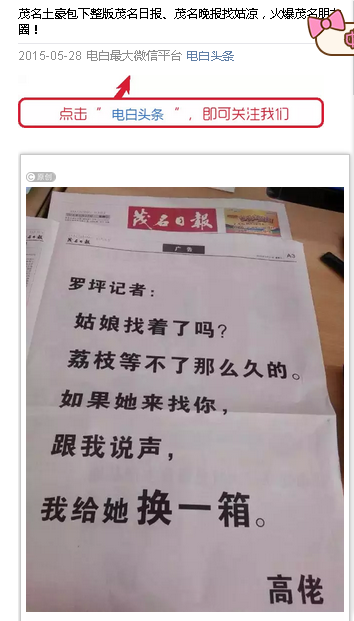 不知道你留意没有,今天茂名日报、茂名晚报都各有一个整版被一个名叫高佬的人包下了,而广告内容全是文字,只有37个大字:“罗坪记者:姑娘找着了吗?荔枝等不了那么久的。如果她来找你,跟我说声,我给她换一箱。高佬”。