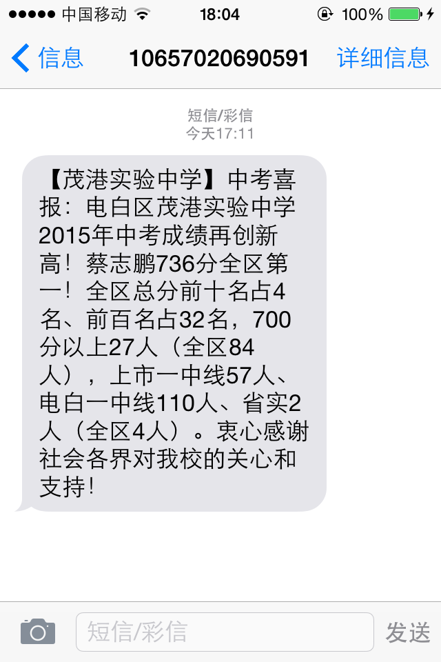 QUOTE(qq8406 @ 2015年07月07日 Tuesday, 06:09 PM) 刚刚吃饭的时候收到一条短信 [attachmentid=341892] [snapback]3764578[/snapback] 只有65个被电白一中录取的