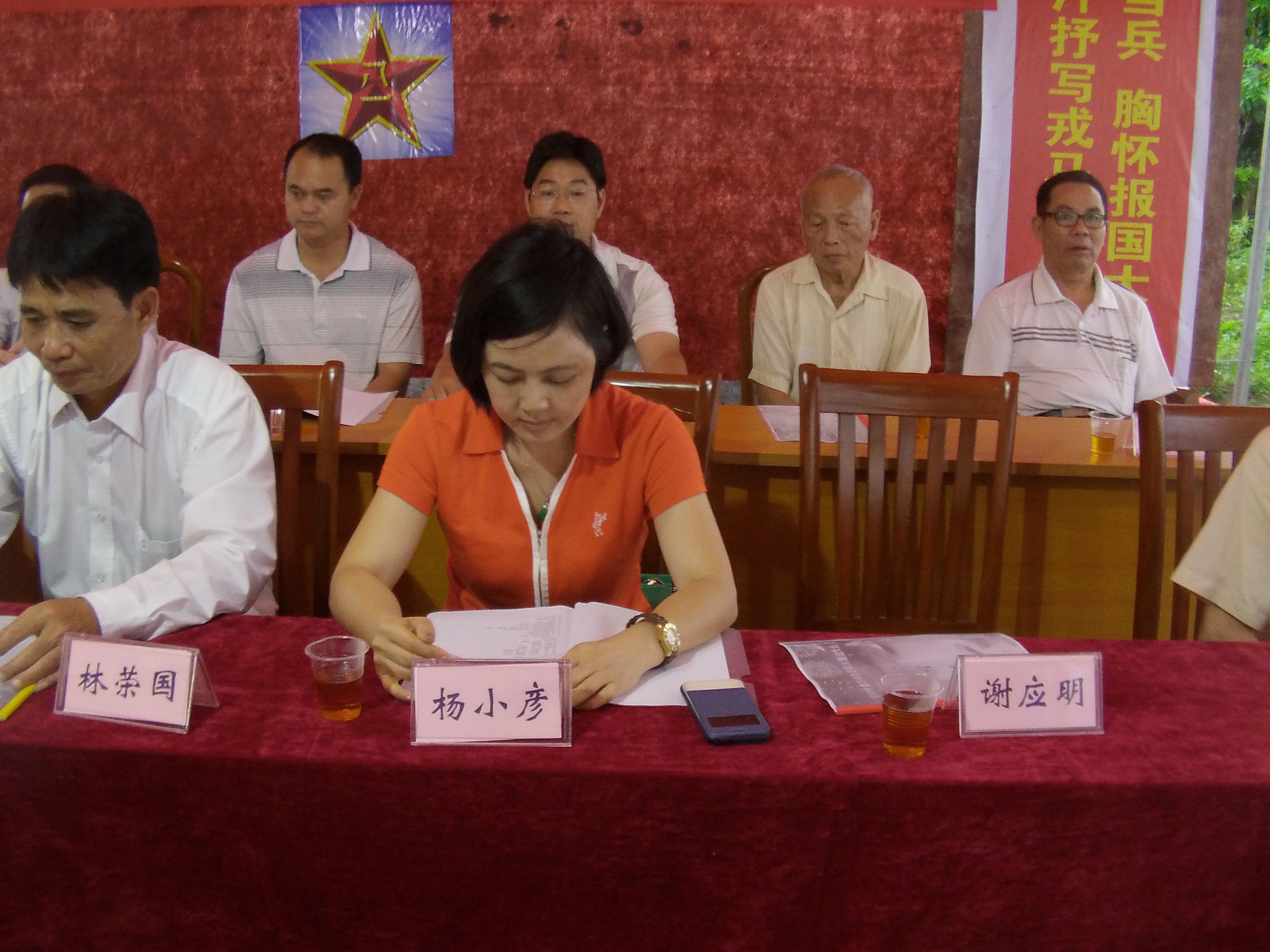 乡贤谢应明先生讲话。谢先生现在是岭南师范学院人文学院党委书记,接到邀请通知后,二话不说,当天一早从湛江驱车回乡与老兵联谊。谢书记在讲话中说:这样的活动很好,村委会干部领导有方,希望乡亲们、老兵们努力建设家乡,既要重武也要重文,要教育好下一代多读书,读好书,学好本领为建设家乡做贡献。