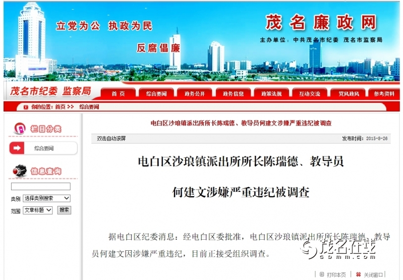 李 李樵夫 荣誉会员 荣誉会员 注册 2011-08-16 消息 2,644 反馈评分 2 点数 0 2015-08-26 #1 据电白区纪委消息:经电白区委批准,电白区沙琅镇派出所所长陈瑞德、教导员何建文因涉嫌严重违纪,目前正接受组织调查。