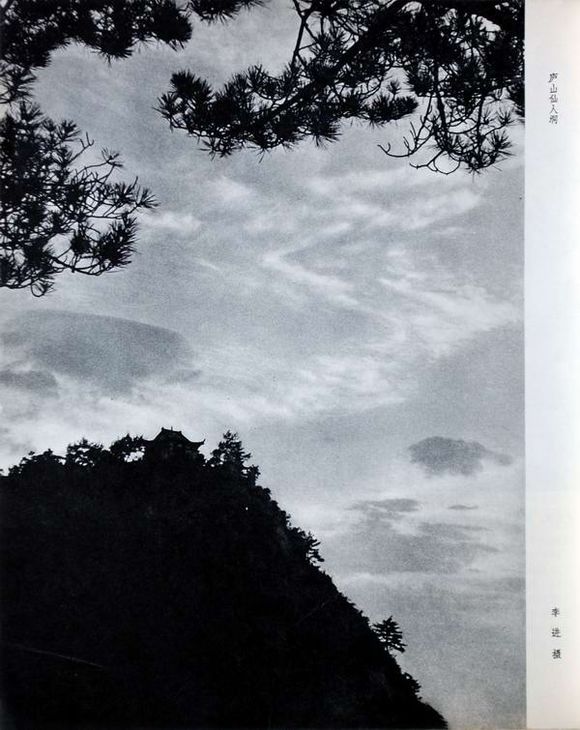 可以看到,江青的照片,看不见仙人洞,景框中部是远景,大片云海在曲折翻滚,白色的云海之中,点缀着几团黑色的稠云。上部是近景,几许苍劲的松枝雄踞空中。下部林木葱茏,险峰挺立,应该是仙人洞近处的险峰,也是近景。