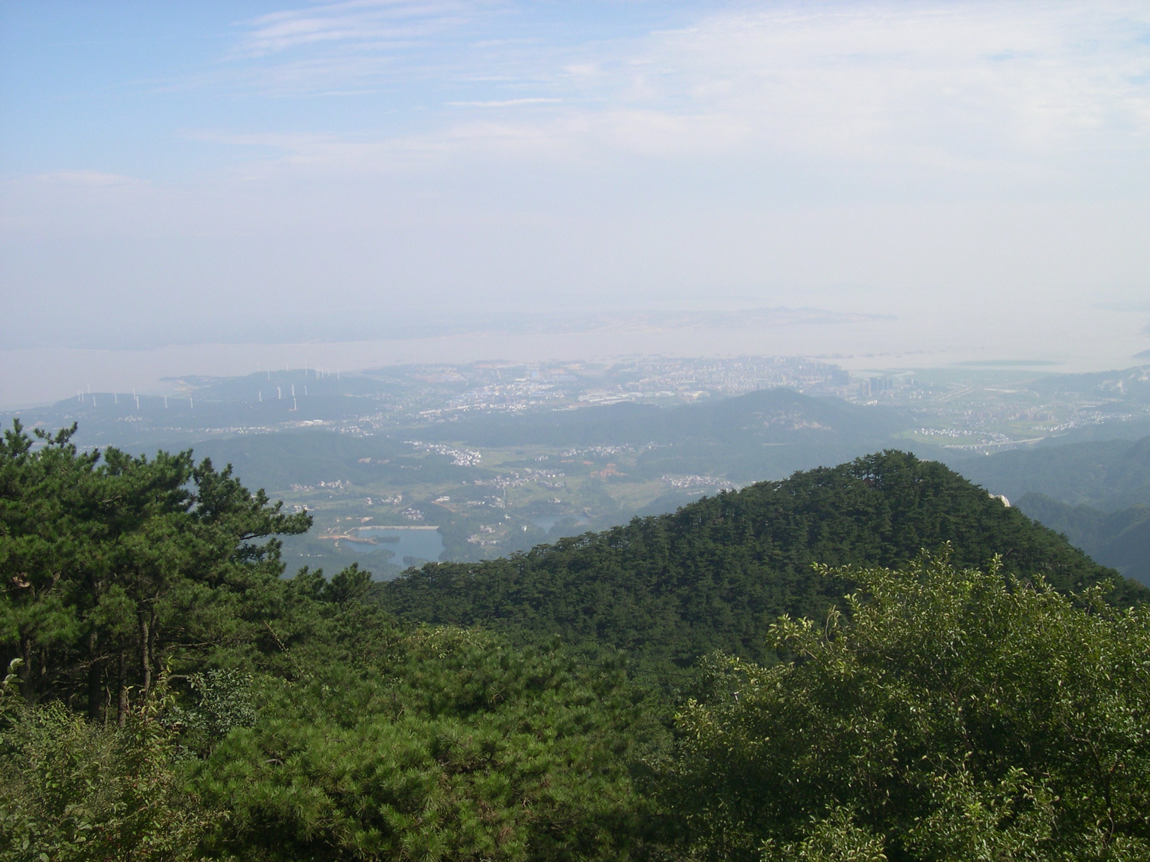 在三叠泉往下看,山下的房舍属江西省天星县,远处是中国第一大淡水湖 ―― 鄱阳湖