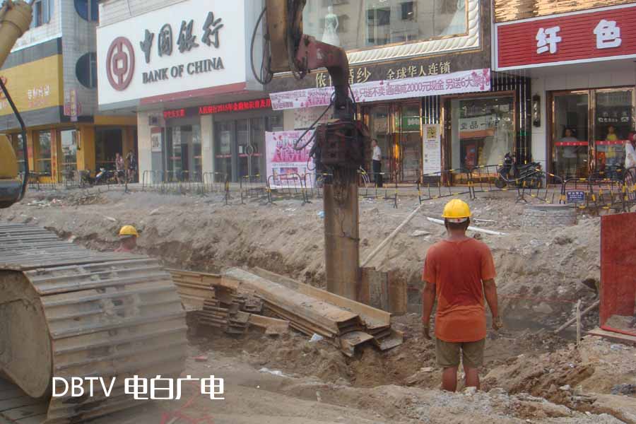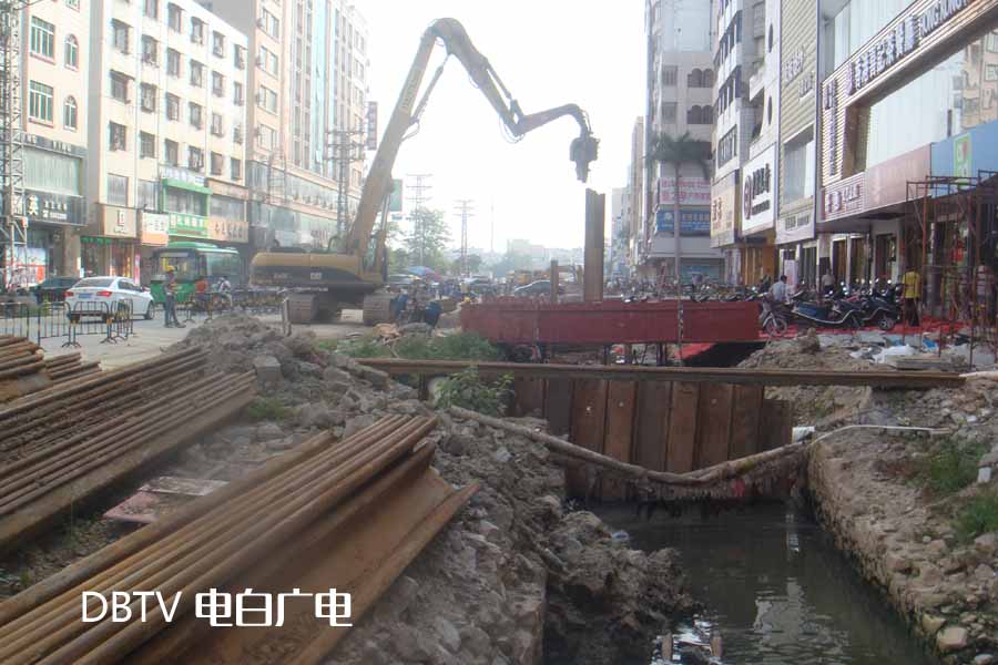 在新湖路,施工人员在路中设置了铁栏,在围闭区里,几台大型设备将一条条铁片打入排污沟中。据施工人员介绍,目前,新湖路正在排污道中间打桩,加紧安装排污管道。沿线商家和居民终于看到该路段重新开工了,都纷纷给点赞。