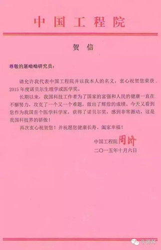 中国工程院院长周济在贺信中说,“尊敬的屠呦呦研究员:请允许我代表中国工程院并以我本人的名义,衷心祝贺您荣获2015年度诺贝尔生理学或医学奖。”