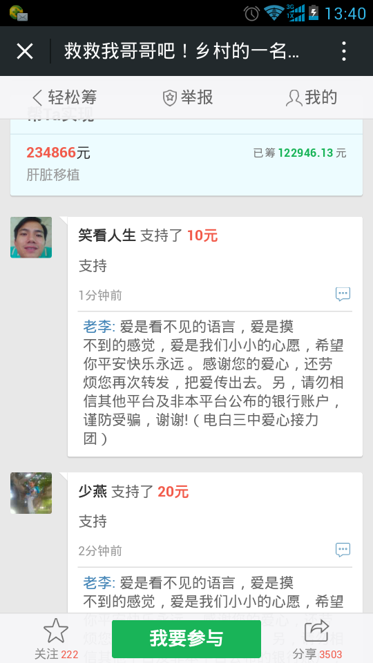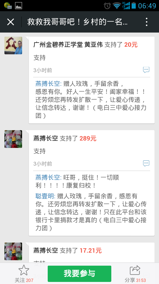 爱心网友接力跑,众募平台已破13万大关!谢谢! 王旺老师的弟弟:王彩丰电话:15989870775 帐号:62170072 0002 0945 260 户名:王彩丰 中国建设银行深圳市南山支行 支付宝账户:wangcaifeng367@163.com 众募平台网址 http://www.qschou.com/project/4c79e852-be1...苯泳杩睿谢谢! 可以在手机直接点击该网址进入捐款的。