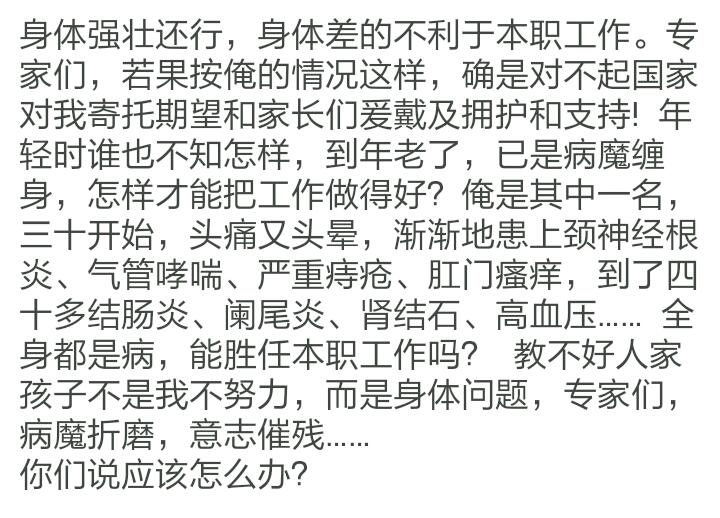 万里缘 小学三年级 注册 2013-03-25 消息 229 反馈评分 1 点数 1 2015-12-04 #7 朋友学校,四十岁以上的教师,个个身体都不好,有高血压病、心血管病、颈椎、腰椎病、胃肠病、风湿病、痔疮病、咽喉炎病、气管炎病、子宫瘤病等,看来其学校也应该有咯