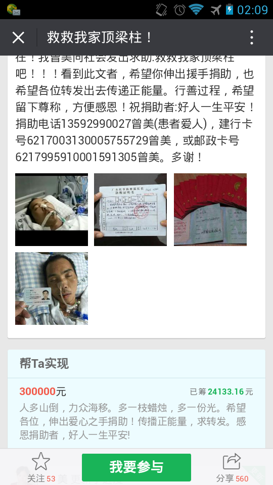 无情灾难发生在2016年1月5日,丈夫驾车为了避让骑车者,在吴川覃巴路段撞向公路中间水泥隔离带,致使车辆冲击力过大,方向盘反弹撞伤腹腔,导致肝裂、脾出血、肠胃穿孔。得知这噩耗我瘫痪无力。当天因大量出血,在吴川急需手术,后情况危重急转湛江附属医院。现在危重病房抢救中,未脱离生命危险期(冯阿壬,7床),每天过万医疗费用和4680元外购药(人血蛋白、卡泊芬净、替加环素),本来拮据的家庭更是雪上加霜!事情发生后,我在亲戚朋友、村中邻居东凑西借,仍是杯水车薪。现在已欠下医疗费用3万多元,后续医疗费用仍无着落!