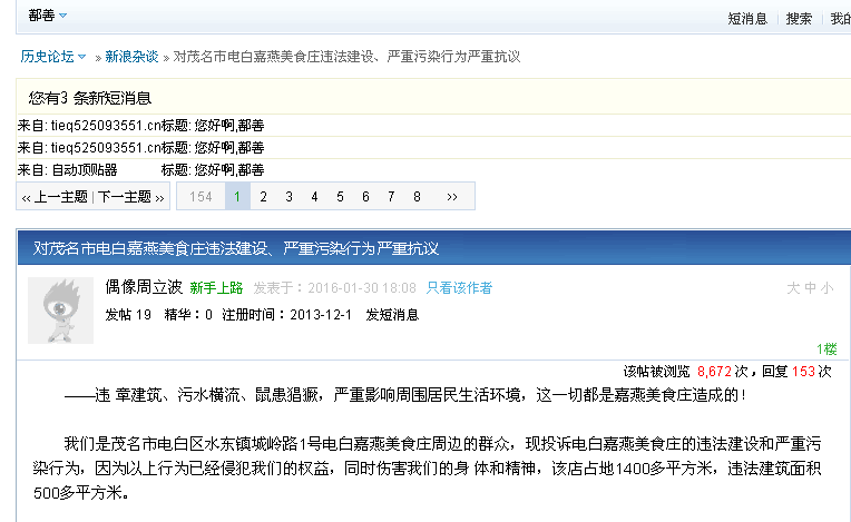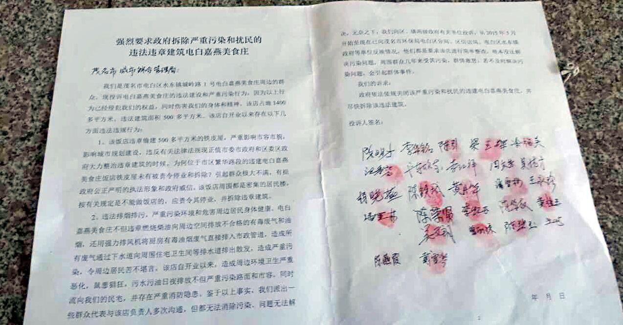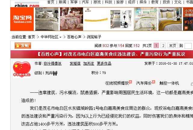 投诉人:茂名市电白区水东镇城岭路1号电白嘉燕美食庄周边的群众 2016 年1月23日