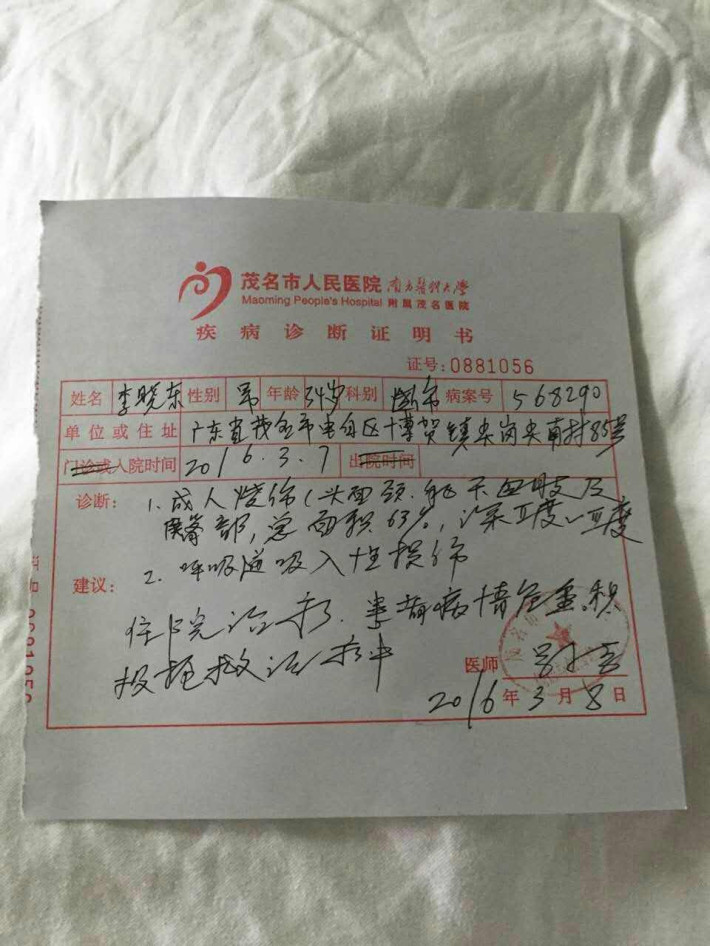 天有不测风云,2016年3月7日上午,一场突如其来的意外煤气泄漏事故,我丈夫李晓东当场被火海包围,现在茂名市人民医院重症监护室进行抢救治疗!经医生诊断鉴定,李晓东全身烧伤面积高达63%,属重度烧伤,呼吸道已被火焰严重灼伤,需插喉管代替呼吸,经抢救仍命悬一线,时间就是生命,我们同死神赛跑。现在每天的治疗费用将近一万元,后续的手术治疗费用估计更是高达50多万元,但是这个金额对我这个靠出海打鱼为生的家庭来说无疑是天文数字,我们已举步为艰。