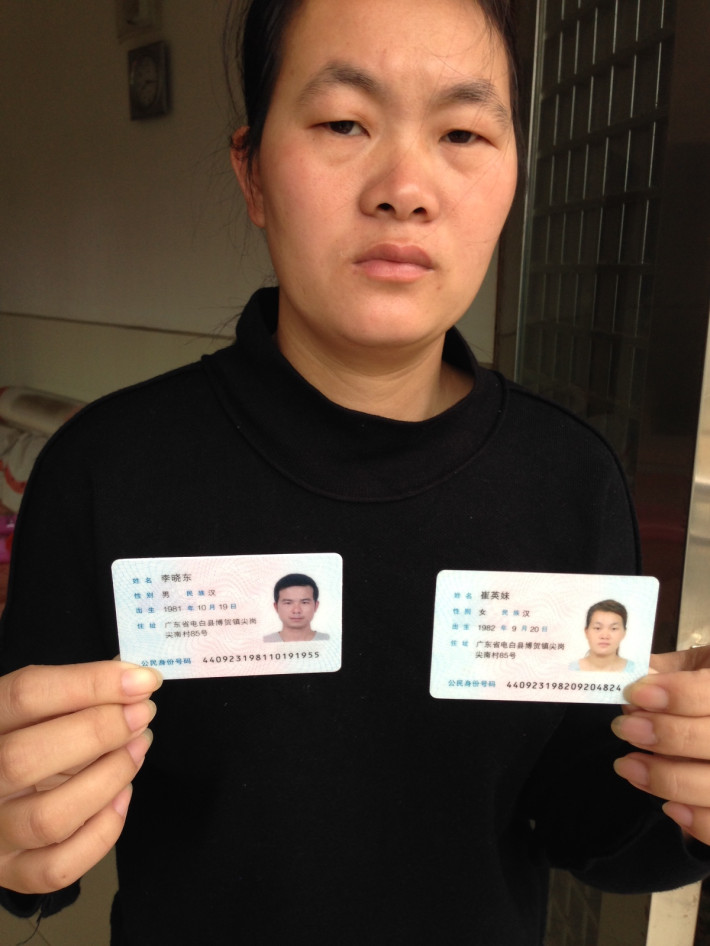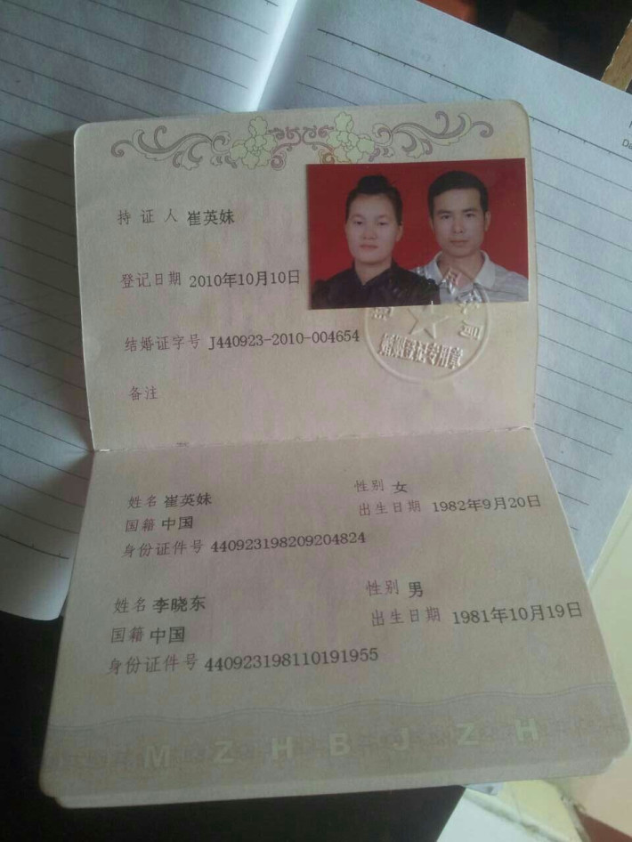 我叫崔英妹 ,身份证号码:440923198209204824, 2010年我与退伍军人李晓东(身份证号码:440923198110191955)结为夫妻,目前育有两位可爱的女儿,全家靠出海打鱼维生,日子过得虽苦犹甜。