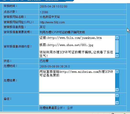 如图,备案系统(http://www.miibeian.gov.cn)首页都声明了http://www.miibeian.com不是他们的网站,在里面的举报系统里,有人提问,工作人员竟然叫人去http://www.miibeian.com备案。真够弱智了!