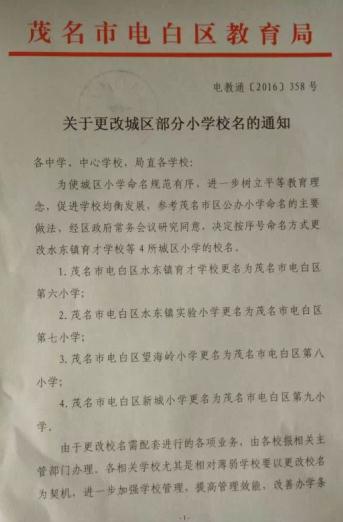 为使城区小学命名规范有序,进一步树立平等教育理念,促进学校的均衡发展,参考茂名市区公办小学命的主要做法,经区政府常务会议研究同意,决定按序号命名方式更改以下4所城区小学的校名。 1、电白区水东镇育才学校更名为电白区第六小学; 2、电白区水东镇实验小学更名为电白区第七小学; 3、电白区望海岭小学更名为电白区第八小学; 4、电白区新城小学更名为电白区第九小学;