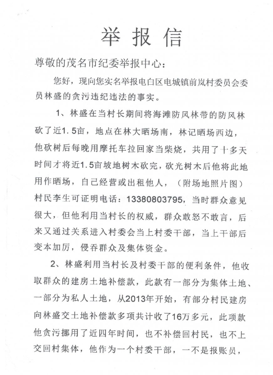 1、林盛在当村长期间将海滩防风林带的防风林 砍了近1.5亩,地点在林大晒场南,林记晒场西边, 他砍树后每晚用摩托车拉回家当柴烧,共用了十多天 时间才将近1.5亩坡地树木砍完,砍光树木后他将此地 用作晒场,自己经营或出租他人,(附场地照片图) 村民李生可证明电话:13380803795,当时群众意见很大,.但他利用当村长的权威,群众敢怒不敢言,后 來又通过关系进入村委会当上村委千部,当上干部后 变本加厉,侵吞群众及集体资金。