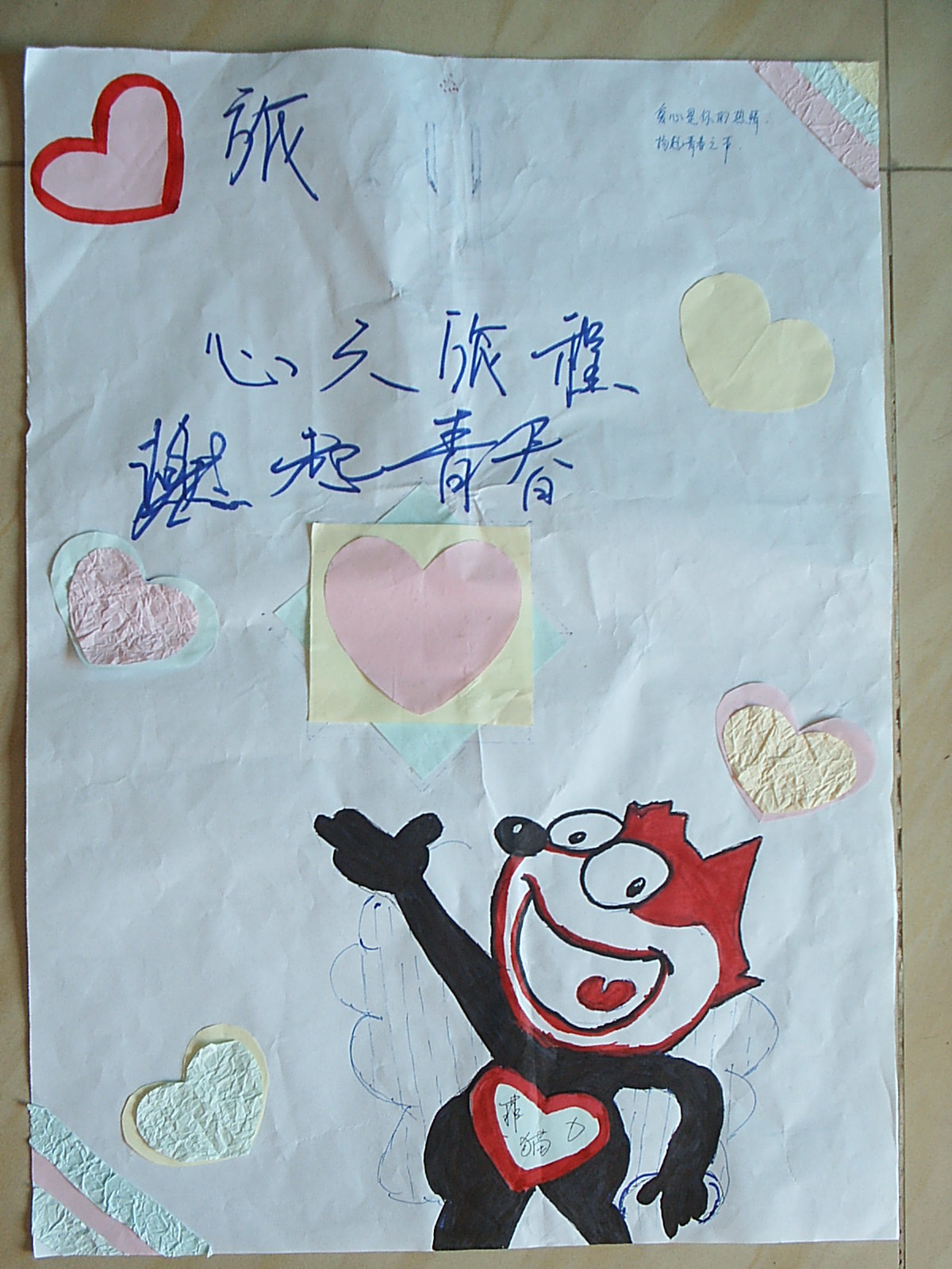 上面那张是其中的一个小组在一个多小时内完成的队旗,同时完成了队名、队呼、队歌和十全十美掌声的创作,他们是炽热队。