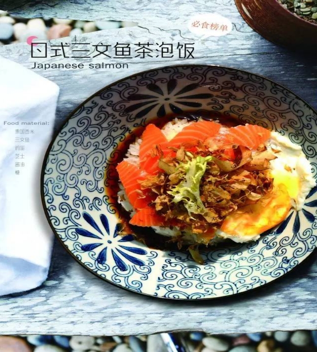 源自日本的一款经典美食——茶泡饭。主要由泰国香米+三文鱼+鸡蛋+芝士+茶汤组成的。日本电影《茶泡饭之味》与电视剧《深夜食堂》中都有说茶泡饭,