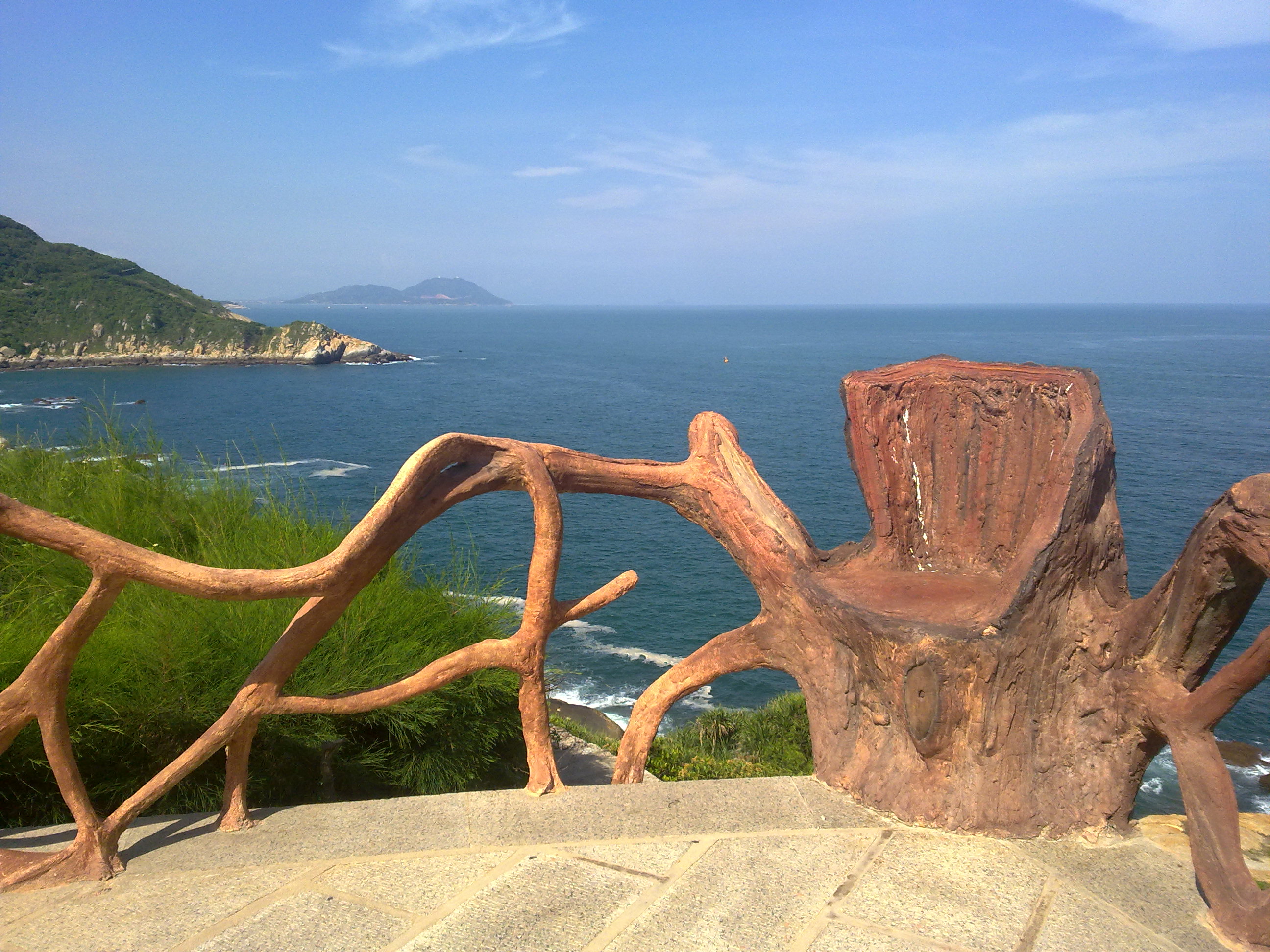 继续往上走到了一个临海的亭子,居高临下,看着一望无际的大海和海面的渔船,海风习习,还是值得驻足的。注意了!!该亭子的围栏是拦不住小朋友的,他要是在地上打闹极有可能一个咕噜就直接坠山崖。没有看到任何的警示牌,两个灭火器早已锈到穿孔。